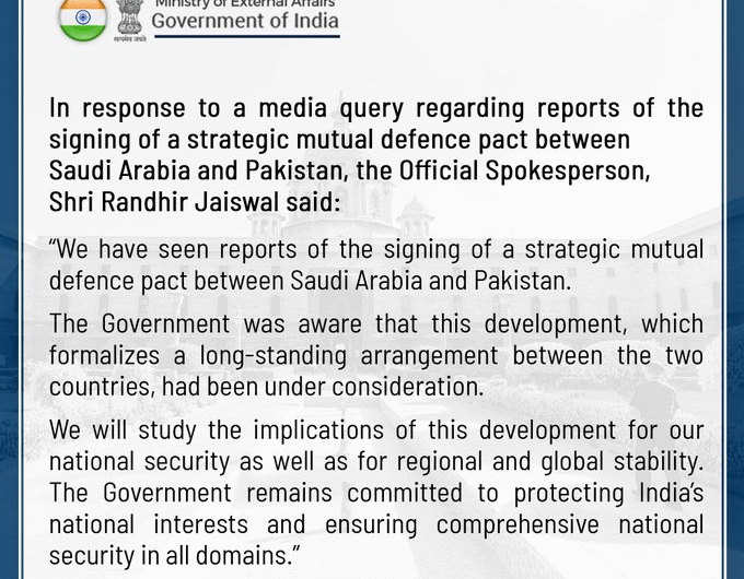 विदेश मंत्रालय ने आज कहा कि वह सऊदी अरब और पाकिस्तान के बीच रणनीतिक पारस्परिक रक्षा समझौते...
