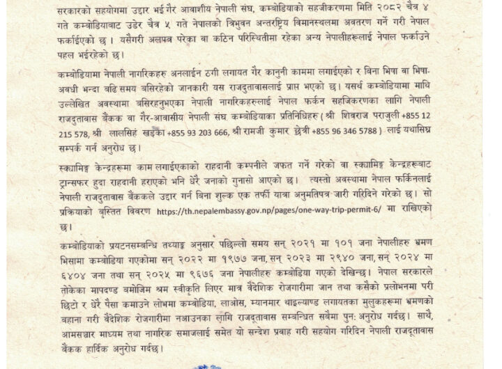 काठमांडू, 19 मार्च। कंबोडिया में विभिन्न कारणों से फंसे 20 नेपाली नागरिकों का सफलतापूर्वक निकाल लिया गया...