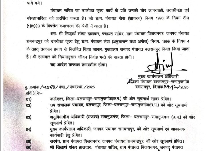 बलरामपुर, 27 दिसंबर । जिले में शासकीय कार्यों में अनुशासन सुनिश्चित करने के लिए प्रशासन ने लापरवाही...
