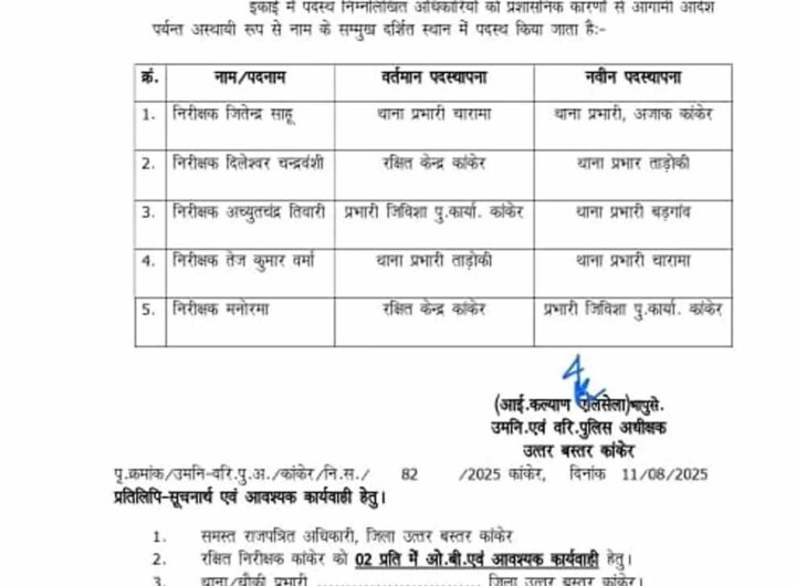 कांकेर / रायपुर 12 अगस्त । छत्तीसगढ़ के कांकेर जिले के पुलिस विभाग में फेरबदल हुआ है,...