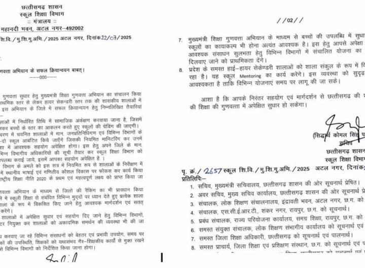 सभी जिलों के कलेक्टरों को पत्र जारी रायपुर 23 जुलाई। मुख्यमंत्री साय की सरकार ने छत्तीसगढ़ की...
