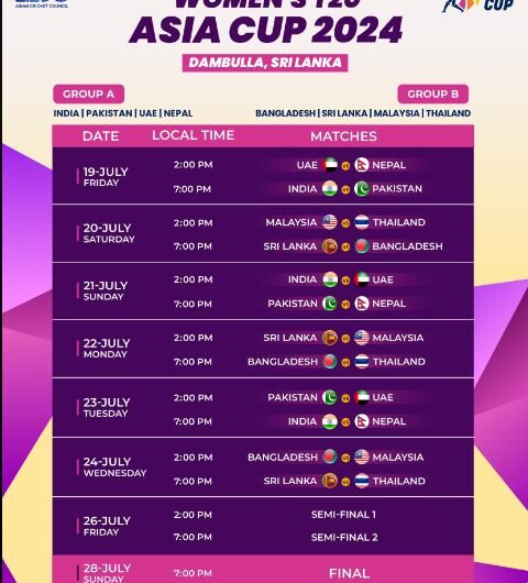 दांबुला, 26 जून । महिला टी20 एशिया कप 2024 की शुरुआत 19 जुलाई को भारत और पाकिस्तान...