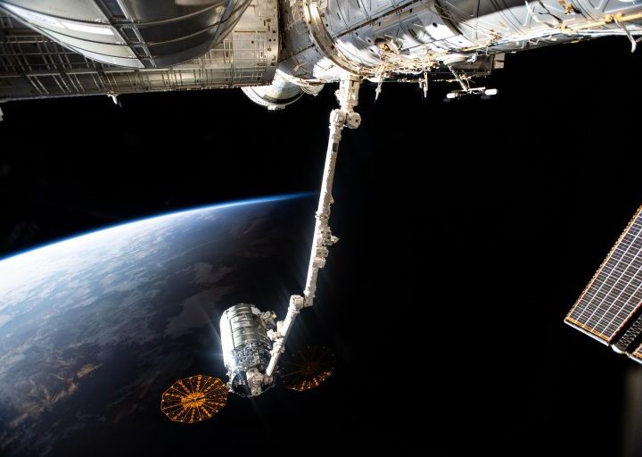 नॉर्थ्रॉप ग्रुम्मन के सिग्नस स्पेस फ्रेटर को अंतर्राष्ट्रीय अंतरिक्ष स्टेशन के यूनिटी मॉड्यूल से निकलने से पहले...