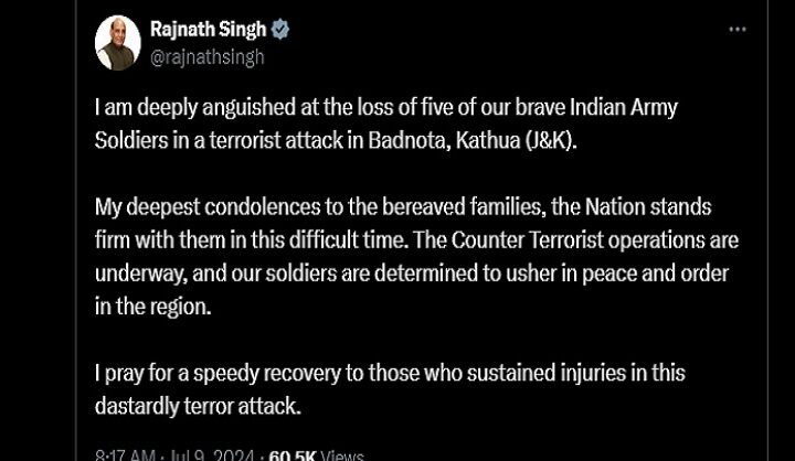 नई दिल्ली, 09 जुलाई । रक्षामंत्री राजनाथ सिंह ने जम्मू-कश्मीर में आतंकी हमले में पांच भारतीय सैनिकों...
