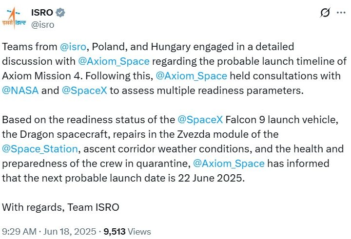 नई दिल्ली, 18 जून । एक्सिओम मिशन-4 के प्रक्षेपण (लॉन्चिंग) की नई संभावित सामने आ गई है।...