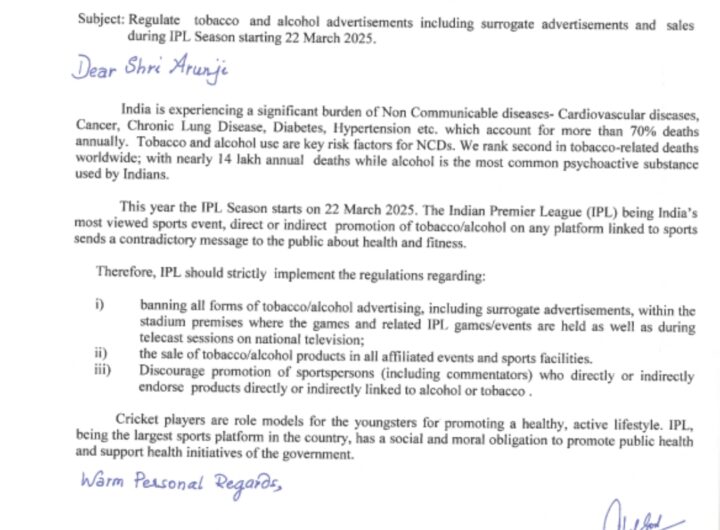 डीजीएचएस ने आईपीएल चेयरमैन को लिखा पत्र, तंबाकू और शराब के विज्ञापनों पर पाबंदी लगाने का किया अनुरोध
