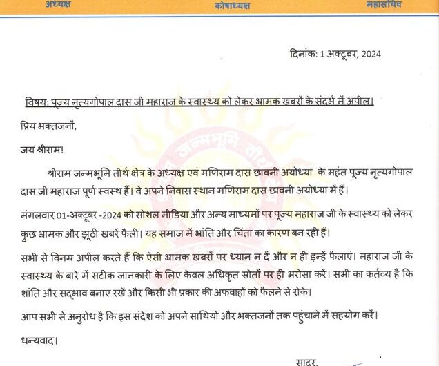 श्री राम जन्मभूमि तीर्थ क्षेत्र न्यास के माननीय अध्यक्ष पूज्य महंत श्री नृत्यगोपाल दासजी महाराज के स्वास्थ्य...