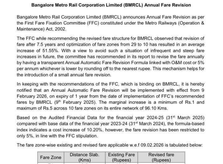 बेंगलुरु, 05 फ़रवरी । मेट्रो में यात्रा करने वाले बेंगलुरुवासियाें को अब अधिक रुपये खर्च करने पड़ेंगे।बेंगलुरु...