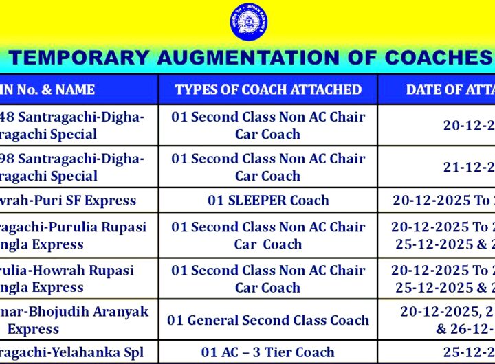 खड़गपुर, 20 दिसंबर। यात्रियों की बढ़ती भीड़ को देखते हुए दक्षिण-पूर्व रेलवे के खड़गपुर मंडल ने अस्थायी...