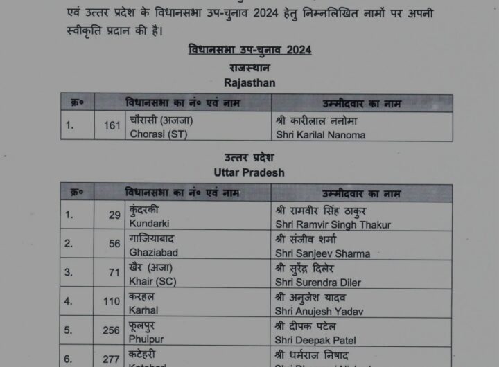 नई दिल्ली, 24 अक्टूबर l भारतीय जनता पार्टी (भाजपा) ने गुरुवार को उत्तर प्रदेश और राजस्थान के विधानसभा...
