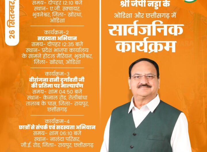 नई दिल्ली, 26 सितंबर । भारतीय जनता पार्टी (भाजपा) के राष्ट्रीय अध्यक्ष और केंद्रीय स्वास्थ्यमंत्री जेपी नड्डा...