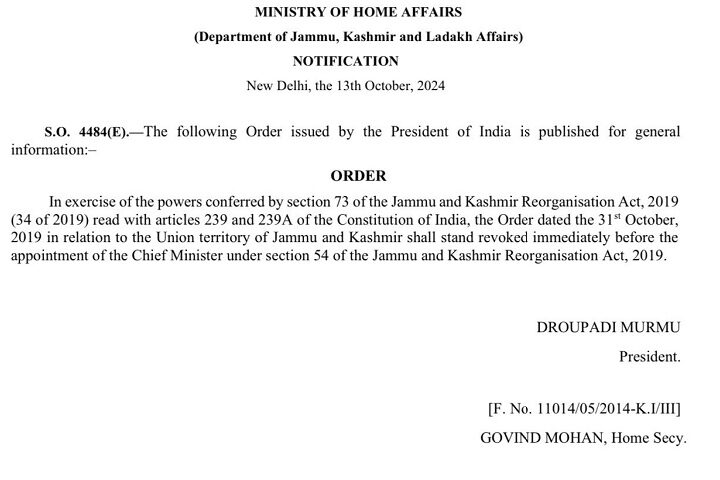 नई दिल्ली, 13 अक्टूबर । जम्मू कश्मीर पर लगे राष्ट्रपति शासन को हटा लिया गया है। गृह...