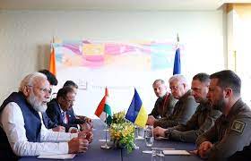 पिछले साल यूक्रेन पर रूसी हमले के बाद पहली बार जेलेंस्की और मोदी की मुलाकात हुई। जी-7 शिखर सम्मेलन के लिए पहुंचे दोनों नेताओं की सम्मेलन से इतर द्विपक्षीय बातचीत हुई। यूक्रेन के राष्ट्रपति से मुलाकात के दौरान भारतीय प्रधानमंत्री नरेन्द्र मोदी ने कहा कि यूक्रेन युद्ध दुनिया का एक बड़ा मुद्दा है। वे इसे सिर्फ अर्थव्यवस्था और राजनीति का मुद्दा नहीं मानते, उनके लिए यह मानवता का मुद्दा है। उन्होंने कहा कि भारत और वे स्वयं भी युद्ध की समस्या के समाधान के लिए हर मुमकिन कोशिश करेंगे।