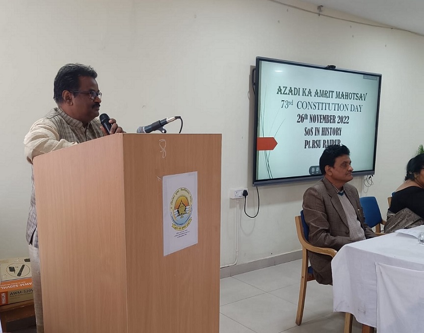 संयुक्त संचालक राज्य सूचना आयोग धनंजय राठौर ने मुख्य वक्ता के रूप कहा कि सन 2015 में भारतीय संविधान निर्मात्री समिति के अध्यक्ष डाॅ बी आर अंबेडकर के 125 वीं जयंती पर 26 नवम्बर को संविधान दिवस घोषित किया गया, तब से इस दिन को संविधान दिवस के रूप में मनाया जा रहा है । उन्होंने कहा कि संविधान एक ऐसा लिखित दस्तावेज होता है जिनके द्वारा किसी देश में शासन व्यवस्था चलाई जाती है इसमें नियम कायदे कानून सरकार की शक्तियाँ अधिकार आदि के बारे में विस्तार से लिखा होता है उसे संविधान कहते हैं ।किसी देश या संस्था द्वारा निर्धारित किए गए वह नियम जिसके माध्यम से संस्था का सुचारु ढंग से संचालन हो सके उसे देश या संस्था का संविधान कहा जाता है।