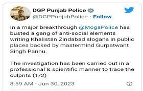चंडीगढ़, 30 जून। पंजाब पुलिस ने पंजाब व हरियाणा में खालिस्तानी नारे लगाकर दहशत फैलाने वाले ग्रुप का पर्दाफाश किया है। यह गिरोह विदेश में बैठे सिख फॉर जस्टिस के मुखी आतंकी गुरपतवंत पन्नू के इशारों पर काम कर रहा था। यही नहीं इस गिरोह ने खालिस्तानी झंडे भी फहराए हैं।