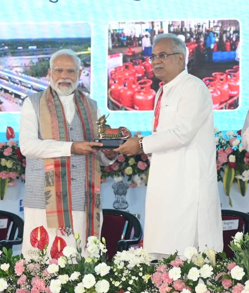 मुख्यमंत्री भूपेश बघेल ने समारोह को संबोधित करते हुए कहा कि छत्तीसगढ़ नवोदित राज्य है, इसलिए छत्तीसगढ़ को ज्यादा से ज्यादा मदद केन्द्र से मिलनी चाहिए। उन्होंने प्रधानमंत्री नरेन्द्र मोदी का स्वागत करते हुए कहा कि यह हमारे लिए बहुत खुशी की बात है कि हमारे प्रधानमंत्री छत्तीसगढ़ के दौरे पर आये हैं। प्रभु श्रीराम के ननिहाल और माता कौशल्या की भूमि में मैं उनका स्वागत करता हूँ। प्रधानमंत्री से हम अनेक मंचों में मिलते हैं और नीति आयोग आदि की बैठकों में मिलते हैं। हम मांगे भी करते हैं लेकिन उन्हें और दोहराना नहीं चाहता। मैं नितिन गडकरी के साथ भी बैठता हूँ जितना मांगते हैं उससे ज्यादा ही देते हैं।