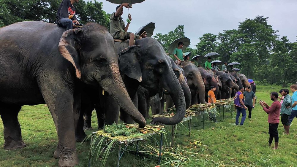 सौराहा में होने वाले एलीफैंट सफारी में सहभागी सभी हाथियों की पहले तो पूजा की गई, फिर केक काटा गया और सभी हाथियों के लिए विशेष खाने पीने की व्यवस्था भी की गई थी।