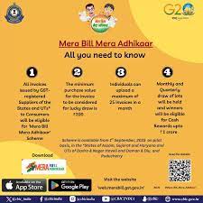 योजना के तहत उपभोक्ताओं को एक करोड़ रुपये का पुरस्कार दिया जाएगा। जीएसटी पंजीकृत आपूर्तिकर्ताओं से उपभोक्ताओं को जारी सभी बिजनेस टू कस्टमर इनवॉइस योजना के पात्र होंगे। न्यूनतम दो हजार रूपये के बिल को लकी ड्रा में शामिल किया जाएगा। केंद्रीय मंत्रालय ने कहा है कि इनवॉइस मेरा बिल मेरा अधिकार मोबाइल एप पर अपलोड की जा सकती है। इन्हें वेबसाइट merabill.gst.gov.in. पर भी अपलोड किया जा सकता है। भारत में किसी भी राज्य या केंद्र शासित प्रदेश के सभी निवासी इस योजना में भाग ले सकते हैं। एक व्यक्ति लक्की ड्रॉ में भाग लेने के लिए एक महीने में अधिक से अधिक 25 बिल अपलोड कर सकता है।योजना के तहत सरकार हर महीने दस हजार रूपये का पुरस्कार देने के लिए आठ सौ लोगों का चयन करेगी। बम्पर ड्रॉ हर तीन महीने में होगा। इसके लिए दो लोगों को एक करोड़ रुपये का पुरस्कार दिया जाएगा। यह प्रायोगिक योजना 12 महीने तक लागू रहेगी।