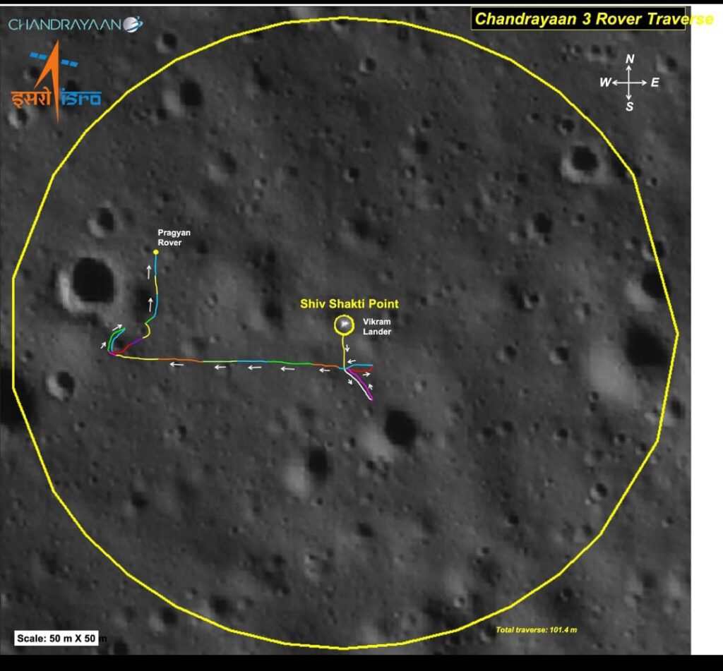 शनिवार को इसरो ने एक्स पर जानकारी साझा करके बताया कि प्रज्ञान रोवर ने चंद्रमा के पर 100 मीटर से अधिक की दूरी तय की है।