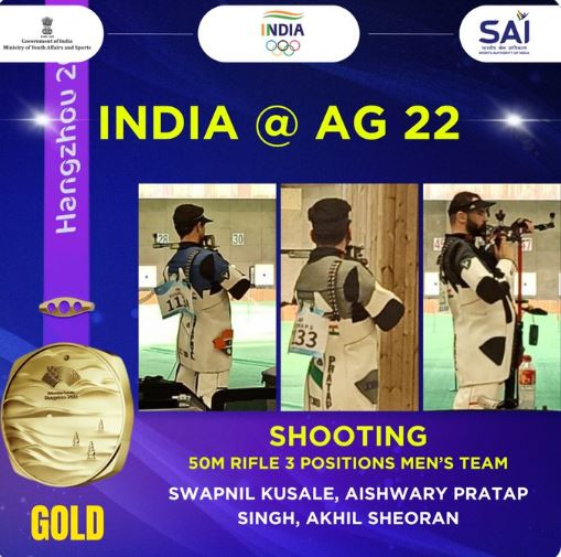 भारतीय पुरुष 50 मीटर 3 पोजिशन राइफल टीम में ऐश्वर्य तोमर, अखिल श्योराण, स्वप्निल कुसाले ने 1769 के रिकॉर्ड स्कोर के साथ स्वर्ण पदक जीता। ऐश्वर्य 591 के साथ शीर्ष पर और स्वप्निल 591 के साथ दूसरे स्थान पर रहते हुए व्यक्तिगत फाइनल में प्रवेश किया।