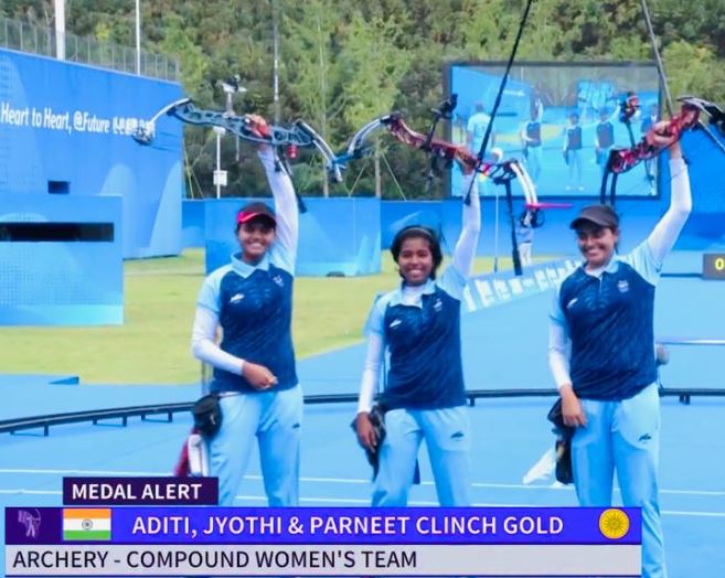 ज्योति, अदिति और परनीत की तिकड़ी ने चीनी ताइपे की यी-ह्सुआन चेन, आई-जौ हुआंग और लू-यून वांग को 230-229 से हराकर स्वर्ण पदक जीता।
