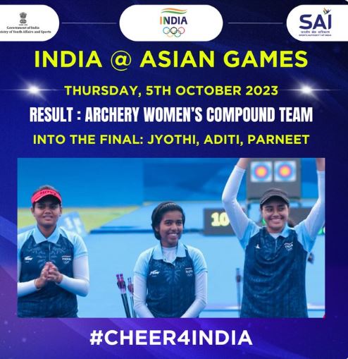 भारतीय तीरंदाज ज्योति वेन्नम, अदिति स्वामी और परनीत कौर की तिकड़ी ने महिला टीम कंपाउंड तीरंदाजी स्पर्धा के सेमीफाइनल में इंडोनेशिया को 233-219 से हराकर फाइनल में प्रवेश किया।