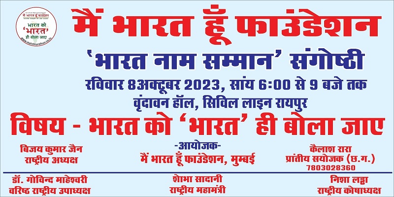 रायपुर । छत्तीसगढ़ की राजधानी रायपुर में रविवार को ‘भारत नाम सम्मान संगोष्ठी’ का आयोजन किया जाएगा।