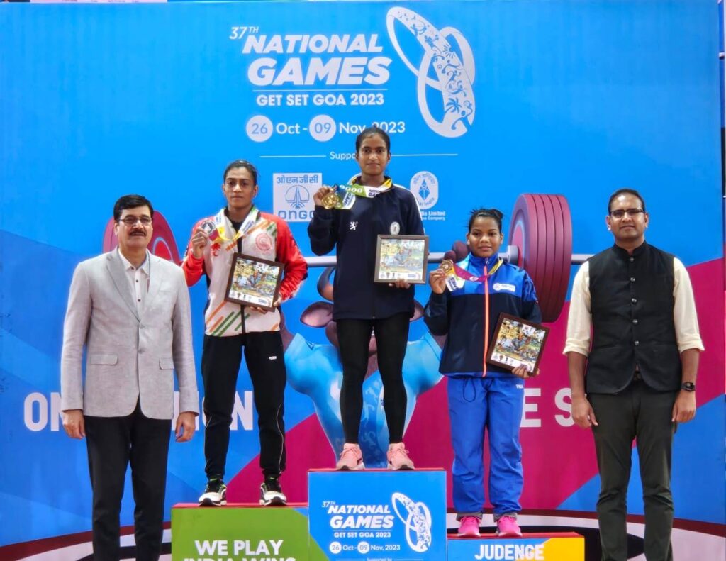 रायपुर । गोवा में 37वीं राष्ट्रीय खेल का आयोजन 26 अक्टूबर से 9 नवम्बर तक भारतीय ओलम्पिक संघ एवं गोवा ओलम्पिक संघ के तत्वावधान में किया जा रहा है। राष्ट्रीय खेल में वेटलिफ्टिंग (भारोत्तोलन) खेल का आयोजन कैम्पल ओपन ग्राउण्ड (कैम्पल स्पोर्ट्स विलेज), पणजी, गोवा में 23 से 25 अक्टूबर तक किया गया।