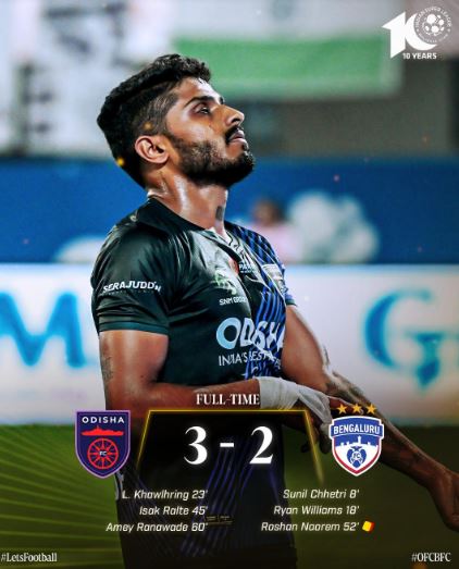 भुवनेश्वर, 1 नवंबर। ओडिशा ने इंडियन सुपर लीग (आईएसएल) 2023-24 के मैचवीक 6 मुकाबले में दो गोल से पिछड़ने के बाद शानदार वापसी करते हुए बेंगलुरू एफसी को 3-2 से हरा दिया। मंगलवार को कलिंगा स्टेडियम में खेले गए मैच में मेजबान ओडिशा एफसी की शानदार जीत में मिडफील्डर लालथाथांगा खवल्रिंग (पुतिया) ने 23वें, लेफ्ट विंगर इसाक वनलालरुआतफेला ने 45वें और राइट-बैक अमय रनावड़े ने 60वें मिनट में गोल दागे। वहीं, बेंगलुरु के लिए सुनील छेत्री ने 8वें मिनट में और रेयान विलियम्स ने 18वें मिनट में गोल किया।