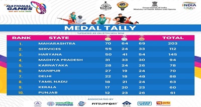 गोवा में 37वें राष्ट्रीय खेलों में महाराष्ट्र का दबदबा जारी है। उसने आज इन खेलों में 200वां पदक हासिल किया। महाराष्ट्र ये उपलब्धि हासिल करने वाली पहली टीम है। मानसी मोहिते ने ट्रायथलॉन मिक्स्ड रिले में टीम के लिए स्वर्ण पदक हासिल किया। महाराष्ट्र ने अब तक 70 स्वर्ण सहित 203 पदक जीत लिए हैं और वो पदक तालिका में शीर्ष पर कायम है। सर्विसेज स्पोर्ट्स कंट्रोल बोर्ड 55 स्वर्ण सहित कुल एक सौ बारह पदक के साथ दूसरे स्थान पर है। हरियाणा पचास स्वर्ण सहित एक सौ पैंतालीस पदक के साथ तीसरे नम्बर पर है।