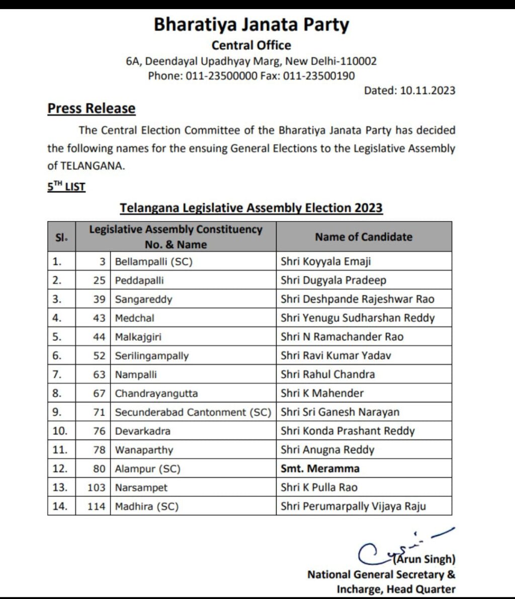 भाजपा की पांचवीं सूची में बेल्लमपल्ली से कोयाला इमाजी, पेड्डापल्ली से दुग्याला प्रदीप, संगारेड्डी से देशपांडे राजेश्वर राव, मेडचल से येनिगु सुदर्शन रेड्डी, मल्काजगिरी से रामचंद्र राव, सेरीलिंगमपल्ली से रवि कुमार यादव, नामपल्ली से राहुल चंद्रा, सिकंदराबाद कैंटोनमेंट से गणेश नारायण, नरसमपेट से पुल्ला राव और मधिरा से पेरूमरपल्ली विजया राजू को उम्मीदवार घोषित किया गया है।