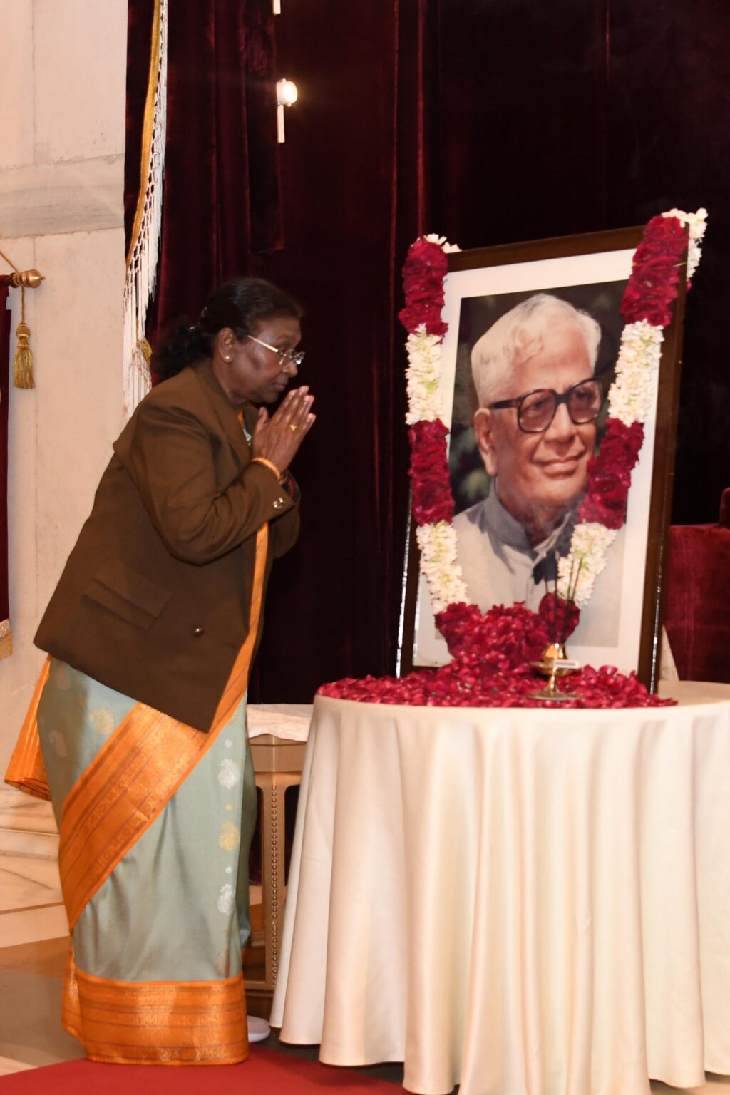 नई दिल्ली, 4 दिसंबर । राष्ट्रपति द्रौपदी मुर्मू ने सोमवार को राष्ट्रपति भवन में पूर्व राष्ट्रपति आर. वेंकटरमन की जयंती पर उनके चित्र के समक्ष पुष्पांजलि अर्पित की। इस मौके पर राष्ट्रपति मुर्मू के अलावा राष्ट्रपति भवन के अधिकारियों और कर्मचारियों ने भी स्वर्गीय वेंकटरमन के चित्र पर पुष्पांजलि अर्पित की।
