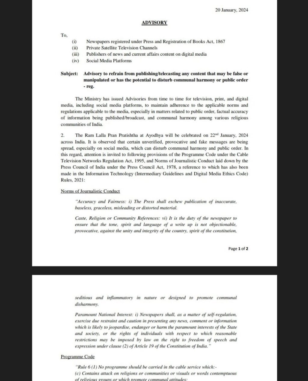 नई दिल्ली, 20 जनवरी । अयोध्या में 22 जनवरी को होने वाले राम मंदिर प्राण प्रतिष्ठा को लेकर मीडिया के लिए एडवाइजरी जारी की गई है।