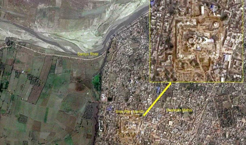रिमोट सेंसिंग सैटेलाइट से ली गई इस तस्वीर में अयोध्या स्थित 2.7 एकड़ में फैले राम जन्मभूमि स्थल को देख सकते हैं। अयोध्या में बन रहे राम मंदिर की इस तस्वीर को इसरो ने पिछले वर्ष 16 दिसंबर को ली थी। हालांकि उसके बाद से अयोध्या में घने कोहरे के चलते अन्य तस्वीरों को लेना कठिन हो गया था। इसरो द्वारा उपग्रह से ली गई तस्वीरों में दशरथ महल और सरयू नदी साफ दिख रही हैं, साथ ही अयोध्या के रेलवे स्टेशन भी दिखा दे रहा है। गौरतलब है कि फिलहाल अंतरिक्ष में भारत के 50 से अधिक उपग्रह हैं, जिनमें से कुछ का रिजॉल्यूशन एक मीटर से भी बहुत कम है। इन तस्वीरों को भारतीय अंतरिक्ष एजेंसी के हैदराबाद स्थित राष्ट्रीय रिमोट सेंसिंग सेंटर से क्लिक किया गया है।