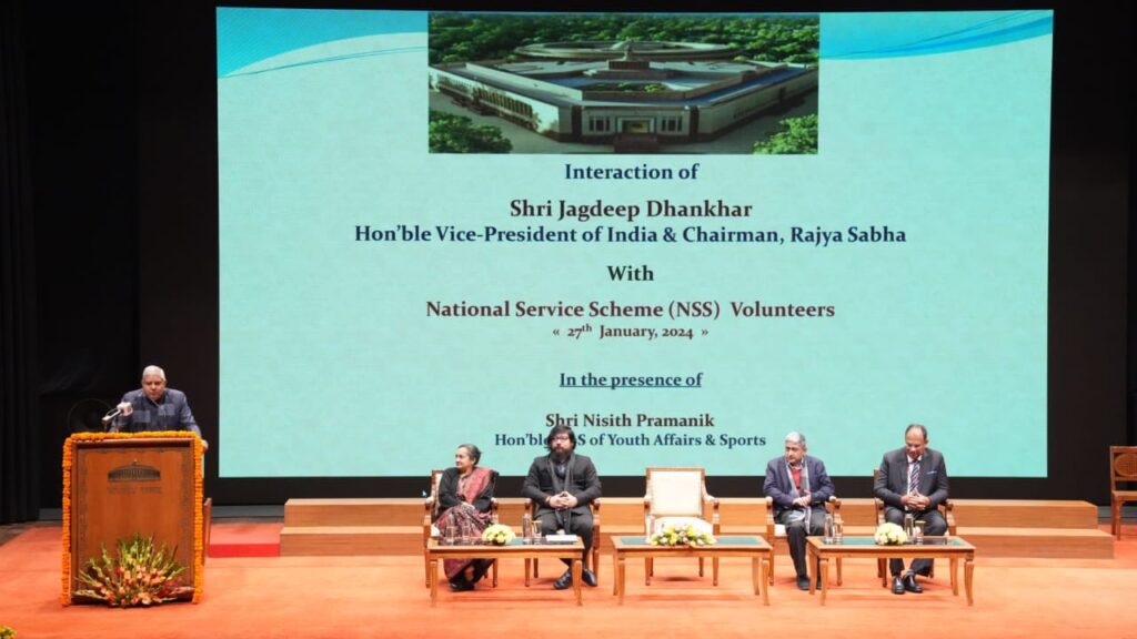 युवाओं को 2047 के भारत के सैनिक और वास्तुकार बताते हुए, धनखड़ ने उपस्थित युवा वॉलंटियर्स से नवोन्वेषी बनने और अनुसंधान और उद्यमिता पर ध्यान केंद्रित करने और गौरवान्वित भारतीय होने और हमेशा राष्ट्र को पहले रखने का आह्वान किया।