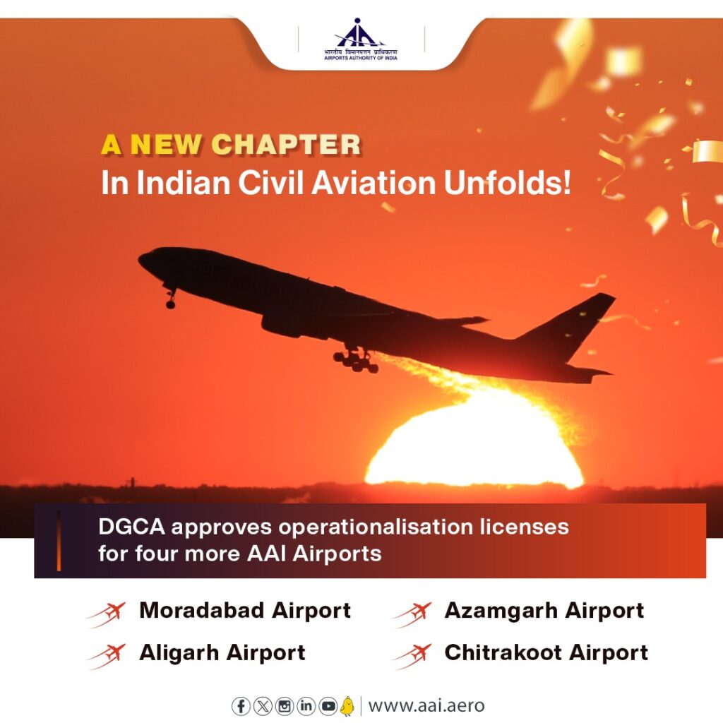 एएआई के मुताबिक यह अनुमति 19 सीटर विमानों के लिए मुरादाबाद, अलीगढ, आज़मगढ़ और चित्रकूट हवाई अड्डों के संचालन के लिए मिली है। इन हवाई अड्डों के संचालन से देश की घरेलू हवाई कनेक्टिविटी मजबूत होगी और क्षेत्र के व्यापार और उद्योग को भी निश्चित बढ़ावा मिलेगा।