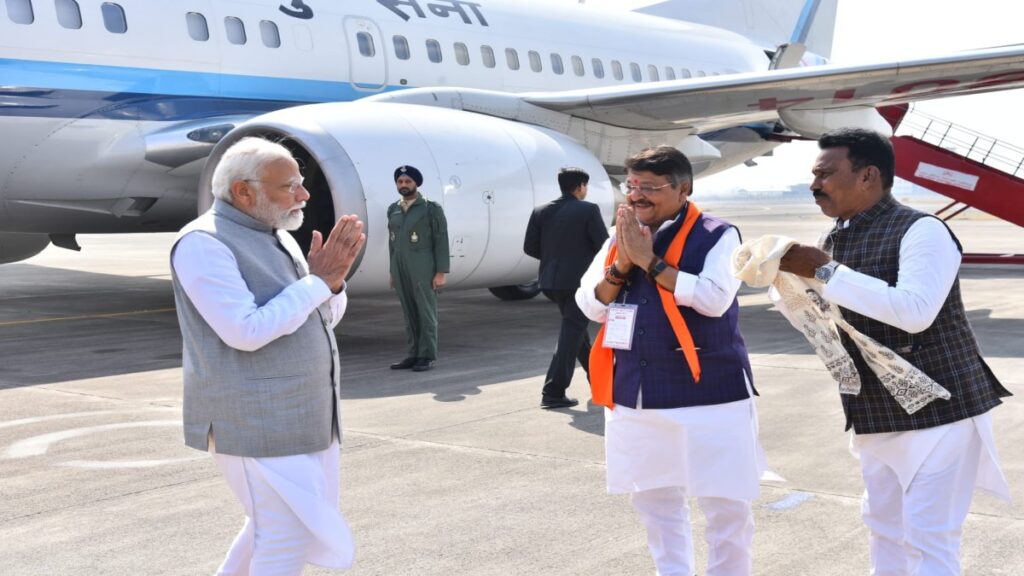 भोपाल, 11 फ़रवरी । झाबुआ में होने वाले जनजातीय सम्मेलन में शामिल होने के लिए प्रधानमंत्री नरेन्द्र मोदी मध्य प्रदेश पहुंच चुके हैं। प्रधानमंत्री मोदी रविवार सुबह 11 बजे इंदौर एयरपोर्ट पहुंचे। यहां एयरपोर्ट पर नगरीय प्रशासन मंत्री कैलाश विजयवर्गीय ने उनका स्वागत किया।