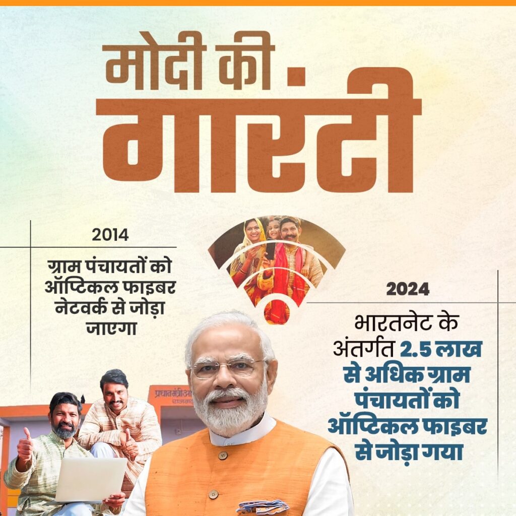 भाजपा ने एक्स पर कहा है, प्रधानमंत्री नरेन्द्र मोदी ने वर्ष 2014 में ग्राम पंचायतों को ऑप्टिकल फाइबर नेटवर्क से जोड़ने की गारंटी दी थी, जिसके तहत अब तक भारतनेट के अंतर्गत 2.5 लाख से अधिक ग्राम पंचायतों को ऑप्टिकल फाइबर नेटवर्क से जोड़ा जा चुका है।’ उल्लेखनीय है कि भारतनेट परियोजना के तहत अब इन ग्राम पंचायतों को ऑप्टिकल फाइबर के जरिये हाईस्पीड ब्रॉडबैंड किफायती दरों पर उपलब्ध है। इसके तहत ब्रॉडबैंड की गति दो से 20 एमबीपीएस तक होगी।