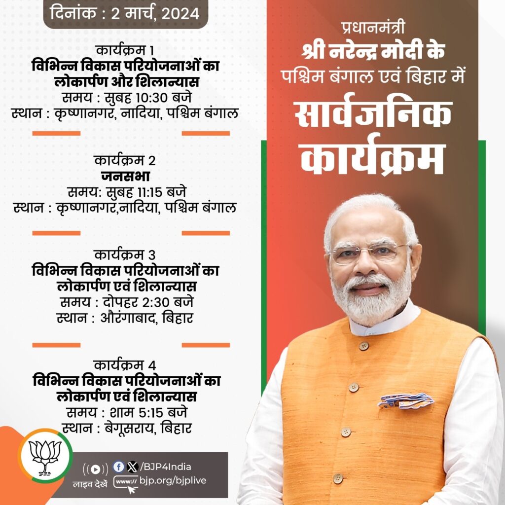 भाजपा के अनुसार, प्रधानमंत्री मोदी आज सुबह 10ः30 बजे पश्चिम बंगाल के कृष्णानगर के नादिया में विकास परियोजनाओं का शिलान्यास और उद्घाटन करेंगे। 45 मिनट बाद यहीं एक जनसभा को संबोधित करेंगे। पत्र सूचना कार्यालय के अनुसार, कृष्णानगर में प्रधानमंत्री मोदी बिजली, रेल और सड़क जैसे क्षेत्रों से संबंधित अनेक विकास परियोजनाओं का उद्घाटन, लोकार्पण और शिलान्यास करेंगे। प्रधानमंत्री पुरुलिया जिले के रघुनाथपुर में स्थित रघुनाथपुर थर्मल पावर स्टेशन चरण-द्वितीय (2×660 मेगावाट) की आधारशिला रखेंगे। दामोदर घाटी निगम की यह कोयला आधारित थर्मल पावर परियोजना में अत्यधिक कुशल सुपर क्रिटिकल तकनीक का उपयोग किया जाता है। नया प्लांट देश की ऊर्जा सुरक्षा को मजबूत करने की दिशा में एक कदम होगा।