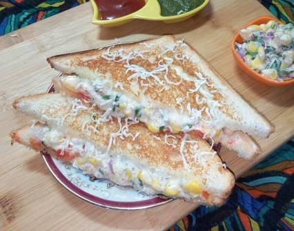 ऑरिगेनो, चिल्ली फ्लेक्स, मक्खन ,प्याज, टमाटर, उबले हुए स्वीट कॉर्न, गाजर, शिमला मिर्च, नमक, काली मिर्च, ब्रेड स्लाइस, पनीर के टुकड़े, हॉट एंट स्वीट सॉस