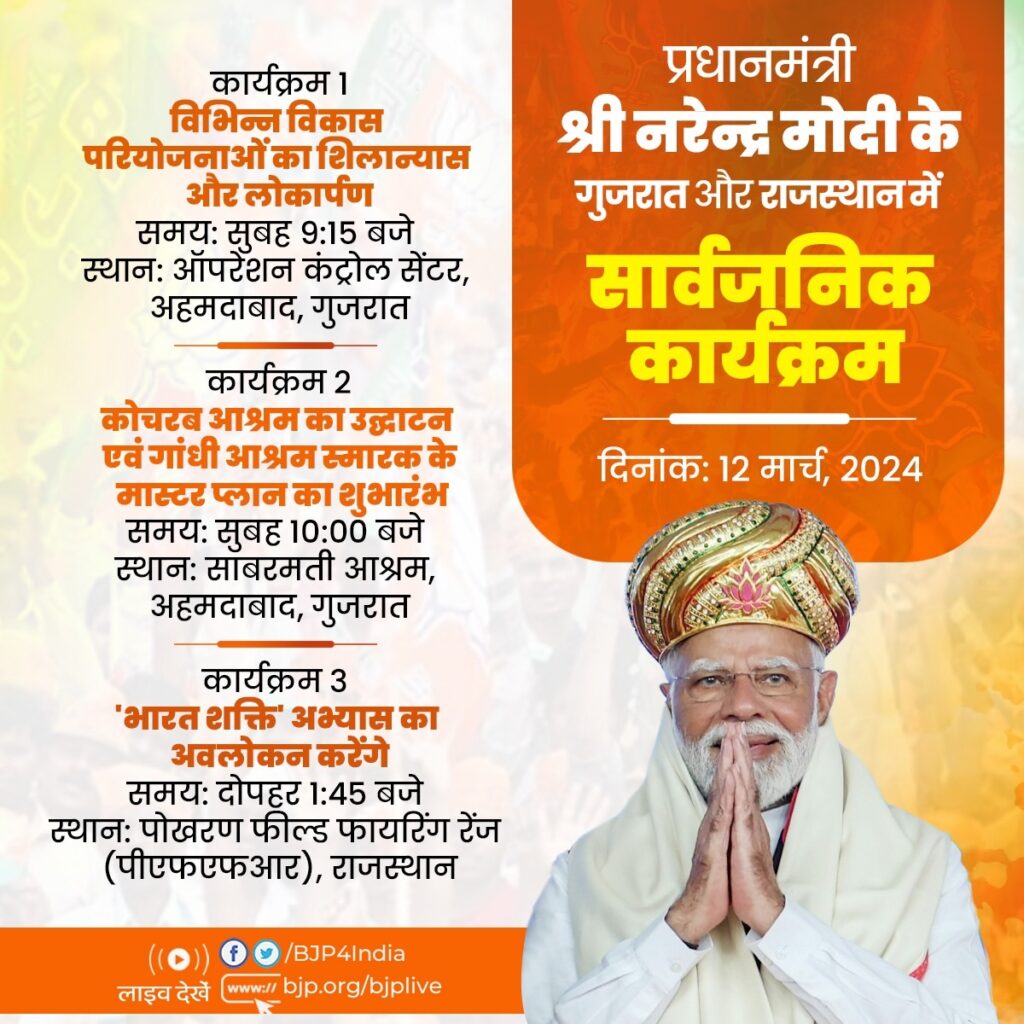 नई दिल्ली, 12 मार्च । प्रधानमंत्री नरेन्द्र मोदी आज (मंगलवार) को गुजरात और राजस्थान का दौरा करेंगे। वो सुबह लगभग 9ः15 बजे अहमदाबाद में 85,000 करोड़ रुपये से अधिक की विभिन्न विकास संबंधी परियोजनाओं में से कुछ की आधारशिला रखेंगे और कुछ को राष्ट्र को समर्पित करेंगे। इसके बाद लगभग 10 बजे प्रधानमंत्री साबरमती आश्रम का दौरा करेंगे। वहां वह कोचरब आश्रम का उद्घाटन करेंगे और गांधी आश्रम स्मारक का मास्टर प्लान भी लॉन्च करेंगे। इसके बाद प्रधानमंत्री मोदी राजस्थान के पोखरण में लगभग 1ः45 बजे भारत शक्ति का अवलोकन करेंगे। यह तीनों सेनाओं के लाइव फायर और कौशल अभ्यास के रूप में स्वदेशी रक्षा क्षमता का वृहद प्रदर्शन है। यह जानकारी पत्र सूचना कार्यालय (पीआईबी) ने विज्ञप्ति में दी है। भारतीय जनता पार्टी (भाजपा) ने अपने एक्स हैंडल पर प्रधानमंत्री मोदी का आज का कार्यक्रम साझा किया है।