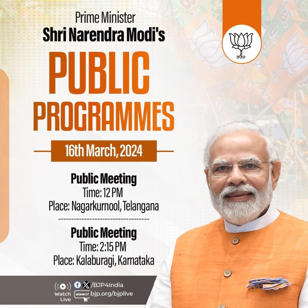 नई दिल्ली, 16 मार्च । प्रधानमंत्री नरेन्द्र मोदी देश में होने वाले आम चुनाव में भारतीय जनता पार्टी (भाजपा) नीत राष्ट्रीय जनतांत्रिक गठबंधन (राजग/एनडीए) को प्रचंड जीत दिलाने के लिए दक्षिण भारत के चुनावी दौरे पर हैं। वो आज (शनिवार) तेलंगाना और कर्नाटक में चुनाव रैलियों में हिस्सा लेंगे। भाजपा ने प्रधानमंत्री मोदी के आज के कार्यक्रम का ब्यौरा एक्स हैंडल पर साझा किया है।