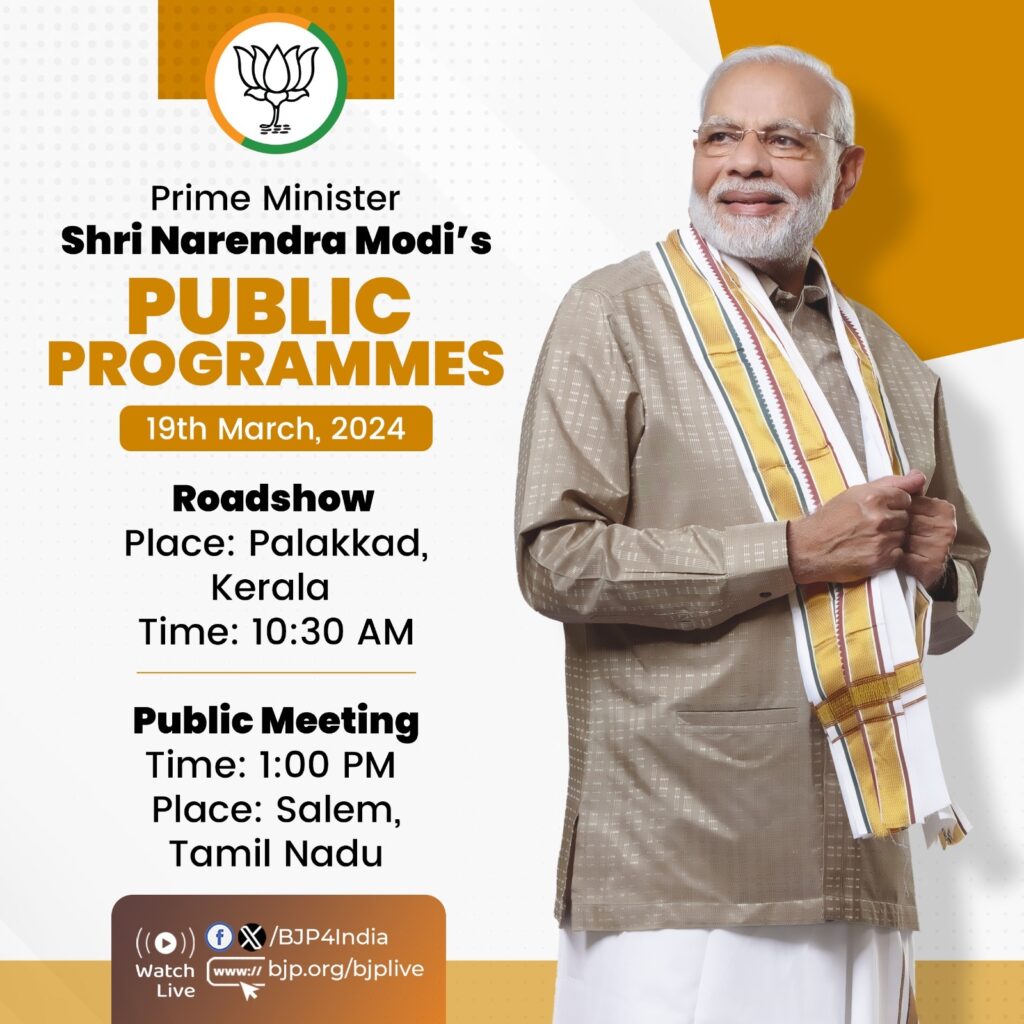 प्रधानमंत्री मोदी के आज के कार्यक्रम का ब्यौरा भारतीय जनता पार्टी (भाजपा) ने एक्स हैंडल पर साझा किया है। एक्स हैंडल पोस्ट के अनुसार, प्रधानमंत्री नरेन्द्र मोदी आज सुबह 10ः30 बजे केरल के पलकक्ड में भाजपा नीत गठबंधन के रोड शो में शामिल होंगे। इसके बाद वो आज दोपहर तमिलनाडु पहुंचेंगे। प्रधानमंत्री नरेन्द्र मोदी तमिलनाडु के सलेम में दोपहर एक बजे भाजपा की जनसभा को संबोधित करेंगे।