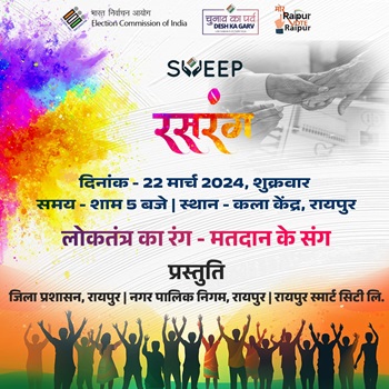 रायपुर । लोकसभा निर्वाचन 2024 अंतर्गत मतदाता जागरूकता संबंधी स्वीप कार्यक्रम के अंतर्गत गीत, संगीत से जुड़े “स्वीप – रसरंग“ कार्यक्रम का आयोजन 22 मार्च, शुक्रवार को शाम 05 बजे कला केन्द्र में किया जाएगा। इस कार्यक्रम में गीत, संगीत, साज़ और आवाज़ से जुड़े कलाकार अपनी प्रस्तुति के माध्यम से मतदाता जागरूकता का संदेश देंगे। इस कार्यक्रम में जिला व पुलिस प्रशासन के आला अधिकारियों के साथ शहर के स्वयं सेवी संगठनों, सामाजिक संगठनों, व्यापारिक संघ, शैक्षणिक संस्थाएं भी शामिल रहेंगे। कार्यक्रम प्रस्तुतिकरण के इच्छुक कलाकार मोबाइल नंबर 9179536565 पर संपर्क कर सकते है।