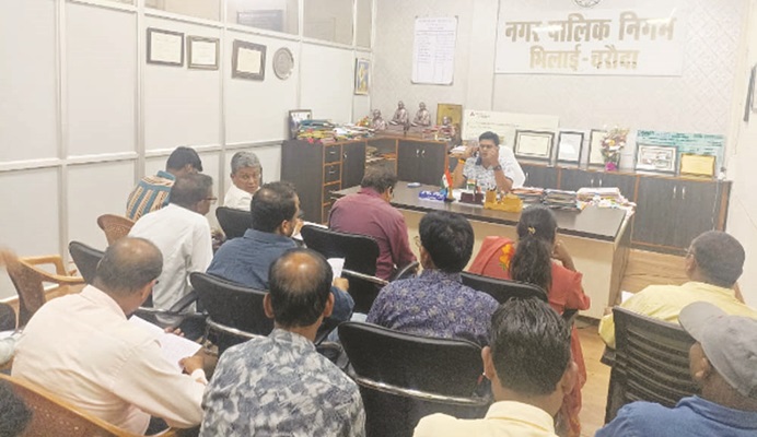 भिलाई । भिलाई-चरौदा निगम कार्यालय में विभागीय कामकाज की समीक्षा करते हुए राजस्व विभाग में कार्यरत एक-एक कर्मचारी से निगम कमिश्नर राजपूत द्वारा टैक्स वसुली की जानकारी प्राप्त की गयी। बता दे कि प्रत्येक वार्ड में संपत्ति कर, समेकित कर, भू-भाटक, शिक्षा उपकर, एवं जलकर की राशि वसूल किये जाने सहायक राजस्व निरीक्षकों को दायित्व प्रदान किये गये है। ये सभी कर्मचारी सहायक राजस्व अधिकारी के अधीन कार्यरत है तथा वार्डो में टैक्स वसूली हेतु अधिकृत है। टारगेट के अनुरूप टैक्स वसूली नही हो पाने के कारण निगम कमिश्नर द्वारा बैठक में रोष प्रकट किया गया। साथ ही शत प्रतिशत टैक्स वसूली कार्य सुनिश्चित करने विभागीय कर्मचारियों को निर्देशित किया गया। आज की बैठक में अनुपस्थित रहे कर्मचारियों को कारण बताओं नोटिस जारी करने के निर्देश राजपूत द्वारा प्रदान किये गये है। सहायक राजस्व अधिकारी अरूणिमा दुबे, सहायक लेखाधिकारी लिंगेश्वर राव सहित ये सहायक राजस्व निरीक्षक दुष्यंत चतुर्वेदी, अर्जुन पाल, मोहम्मद यासीन, सीताराम चौहान, सरोजनी यदु, संतोष सिन्हा, कन्हैया सोनी, अनिल सिंह, पुरानिक साहू, पदुम देशलहरे, रामचंद निषाद, बसंत वर्मा, दिपक निषाद, बलराम चेलक, लालराम साहू, सृष्टि चन्द्राकर, किरण नायक, रामअवतार साहू उपस्थित रहे।