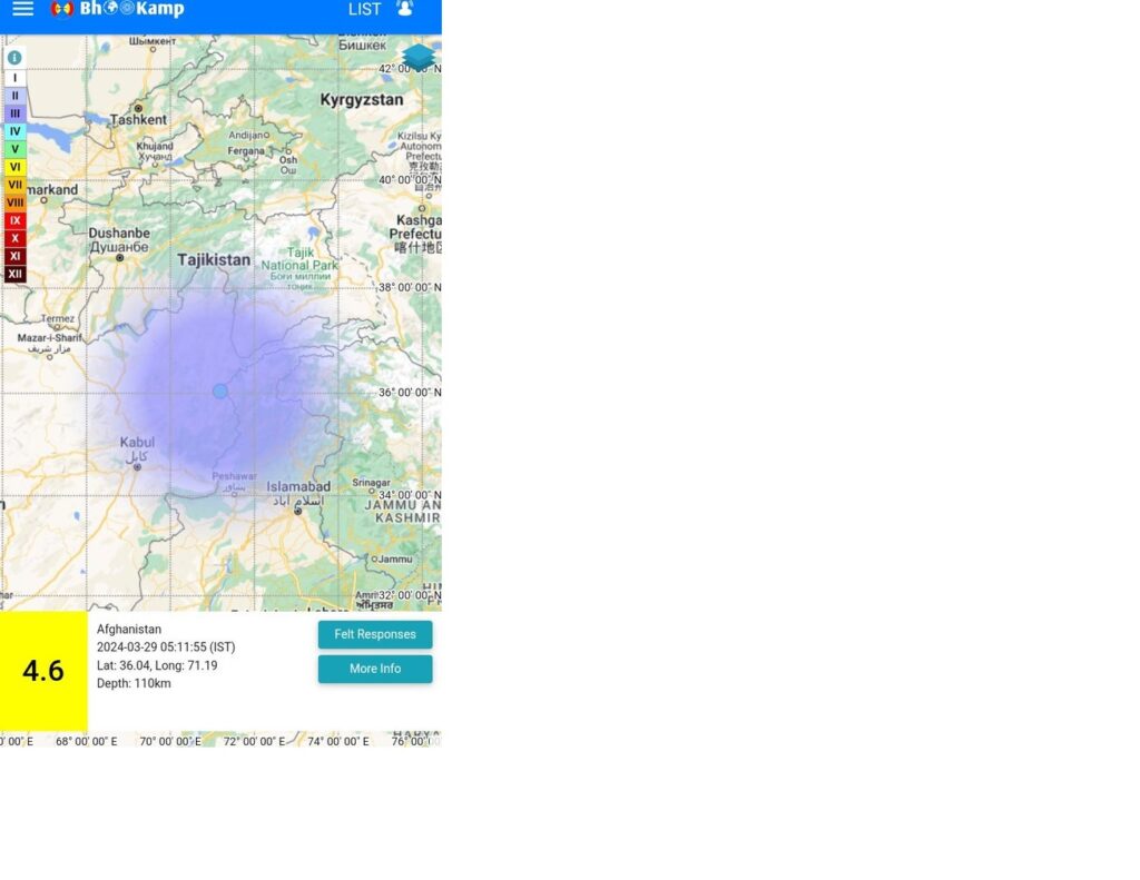 भारत के राष्ट्रीय भूकंप विज्ञान केंद्र ने एक्स हैंडल पर अफगानिस्तान में आए ताजा भूकंप का ब्यौरा साझा किया है। इससे पहले कल (गुरुवार) सुबह स्थानीय समयानुसार 5:44 बजे रिक्टर पैमाने पर 4.2 तीव्रता का भूकंप आया था। उल्लेखनीय है कि भूकंप के लिहाज अफगानिस्तान बेहद संवेदनशील है। अफगानिस्तान में पिछले साल अक्टूबर में आए तूफान से भारी तबाही हो चुकी है। इसकी तीव्रता रिक्टर स्केल पर 6.3 मापी गई थी। इस भूकंप ने 2053 से ज्यादा लोगों को पलक झपकते ही मौत की नींद सुला दिया था।