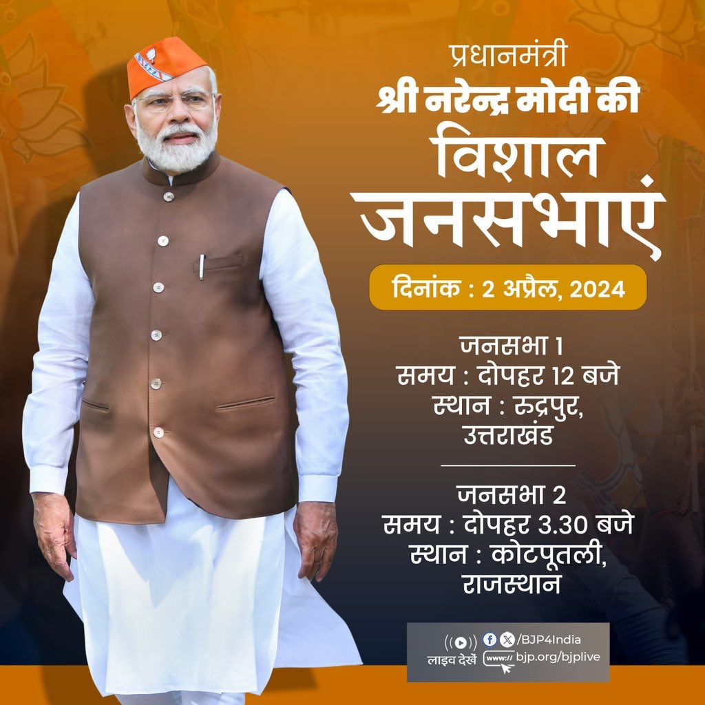 भाजपा ने एक्स हैंडल पर यह जानकारी साझा की है। प्रधानमंत्री मोदी दोपहर 12 बजे उत्तराखंड के रुद्रपुर और अपराह्न 3ः30 बजे राजस्थान के कोटपूतली में पार्टी की जनसभा संबोधित करेंगे। उल्लेखनीय है कि उत्तराखंड की कुल पांच लोकसभा सीटों के लिए 19 अप्रैल को पहले चरण में मतदान होगा।
