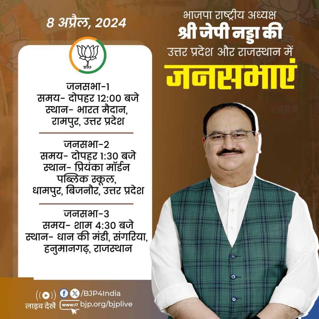 भाजपा के एक्स हैंडल के अनुसार, पार्टी अध्यक्ष दोपहर 12 बजे उत्तर प्रदेश के रामपुर पहुंचेंगे। रामपुर के भारत मैदान में भाजपा की जनसभा को संबोधित करेंगे। इसके बाद नड्डा दोपहर 1ः30 बजे बिजनौर जिले के धामपुर पहुंचेंगे। वह यहां प्रियंका मॉर्डन पब्लिक स्कूल में जनसभा को संबोधित करेंगे। आखिर में शाम को वह राजस्थान जाएंगे।
