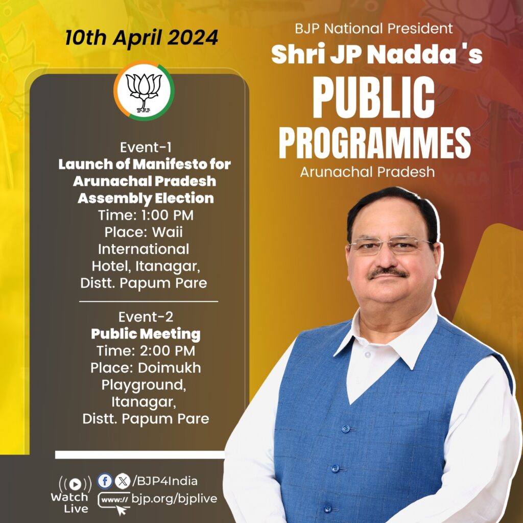 भाजपा के एक्स हैंडल के अनुसार, पार्टी अध्यक्ष नड्डा दोपहर एक बजे अरुणाचल प्रदेश विधानसभा चुनाव के लिए भाजपा का संकल्प पत्र (चुनाव घोषणापत्र) जारी करेंगे। इसके बाद दोपहर 2 बजे अरुणाचल प्रदेश के ईटानगर के दोईमुख खेल मैदान में जनसभा को संबोधित करेंगे।