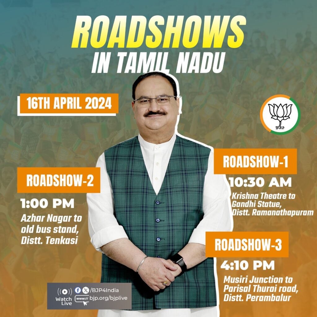 भाजपा के एक्स हैंडल के अनुसार, अध्यक्ष जेपी नड्डा सबसे पहले सुबह 10ः30 बजे रामानाथपुरम के पिलाराम में कृष्णा थियेटर से गांधी प्रतिमा तक रोड शो निकालेंगे। दोपहर एक बजे वो तेनकासी में होंगे। यह अजहर नगर से ओल्ड बस स्टैंड तक निकाले जाने वाले भाजपा के रोड शो की अगुवाई करेंगे। आखिर में शाम को पेरम्बोलुर में होंगे। यहां लगभग चार बजकर 10 मिनट पर रोड शो शुरू होगा। भाजपा अध्यक्ष रोड शो में शामिल होकर भाजपा उम्मीदवारों के पक्ष में प्रचार करेंगे।